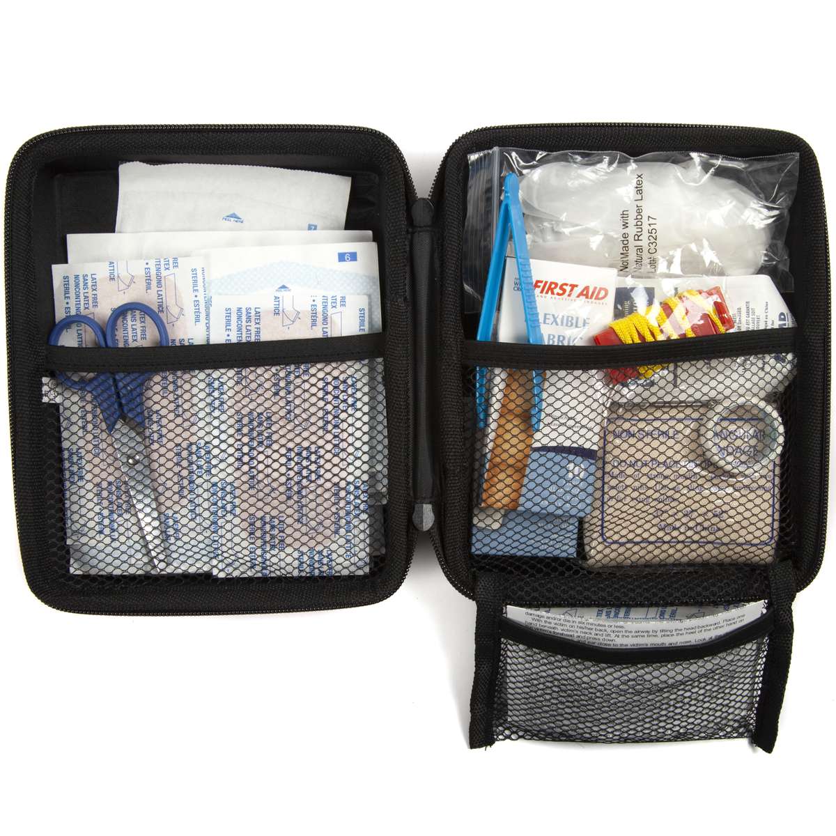 A very well stocked first aid kit in a sturdy EVA case that stores conveniently in your trunk to provide peace of mind.