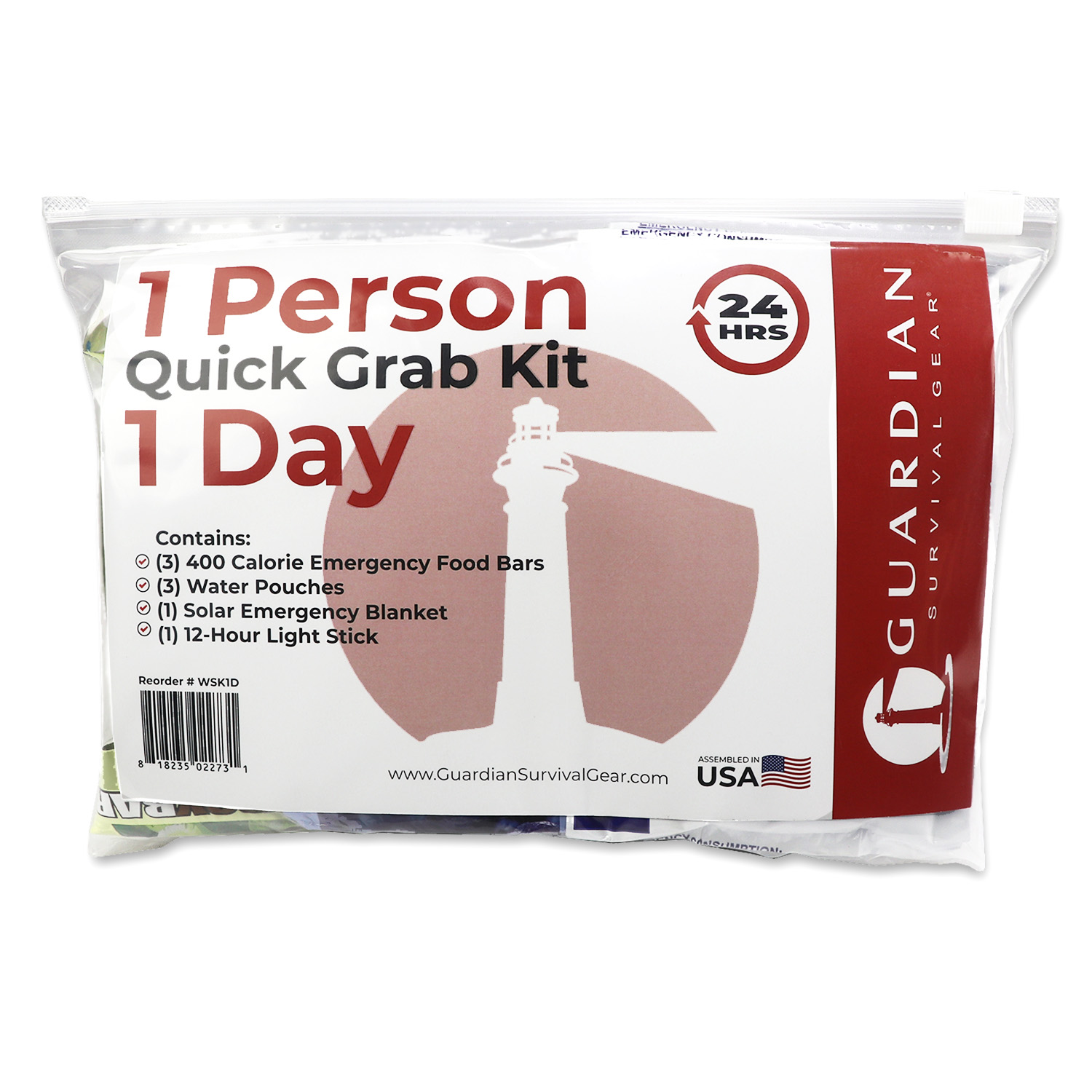 Skip to contentBe ready for any emergency with the 1 Day Quick Grab Kit. This lightweight, compact kit is packed with essential survival items for one person, all conveniently stored in a resealable bag for easy access and portability.