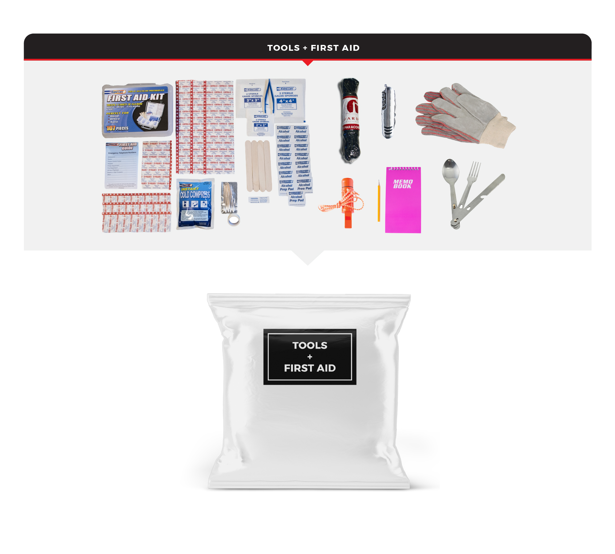 Tools and First Aid: These tools can be useful when you need help with navigation, transport, personal protection, or shelter. AÂ first aid kit can be used to treat minor injuries and protect against more serious health threats in a disaster.