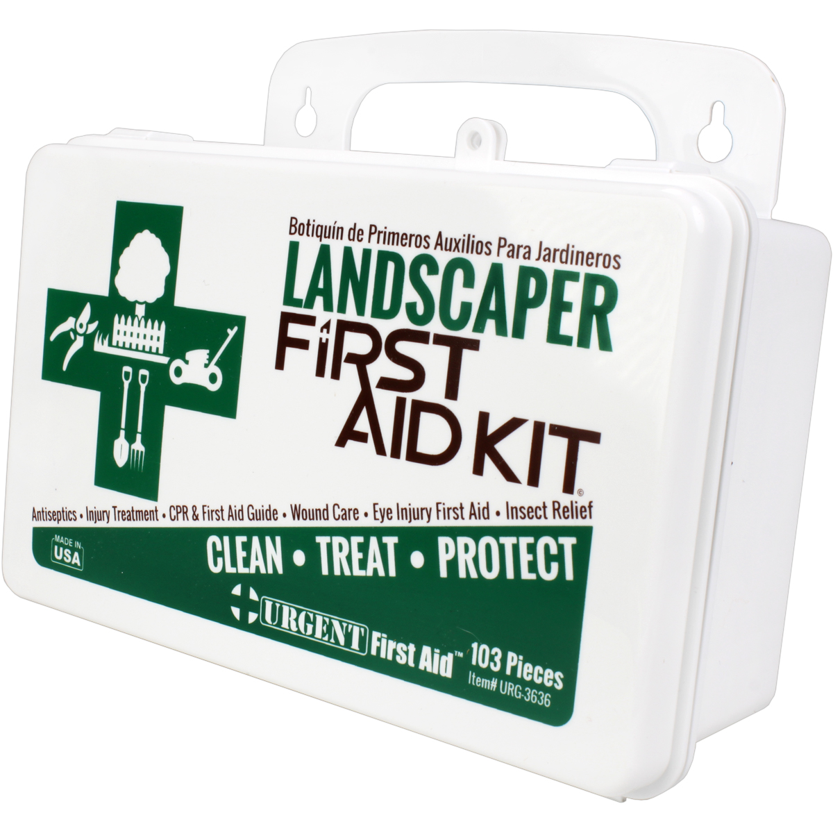 With our new, updated 103-piece, 10-unit landscaper’s first aid kit, you’re prepared to face the outdoors. Keep this kit within easy reach and treat insect stings, minor cuts, sprains and eye irritations. Products are contained in a sturdy plastic case with gasket. Designed to keep workers safe in landscaping and tree-trimming work, and a big hit with home gardeners, too!