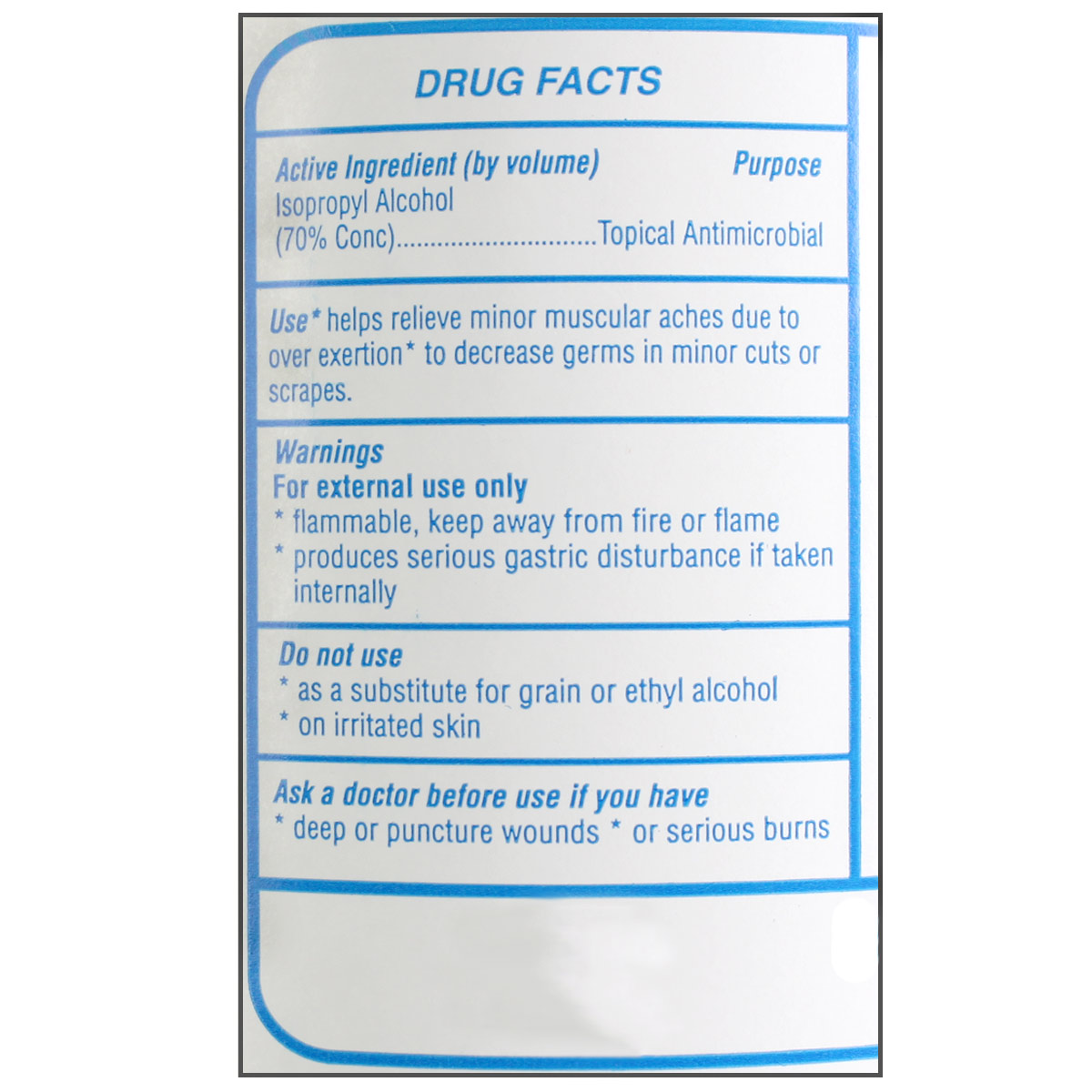 When fighting infection, we highly recommend Isopropyl. For external use only. Active ingredient: Isopropyl alcohol 70% by volume.