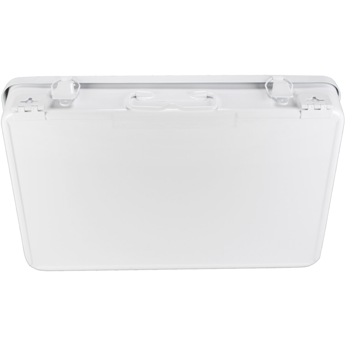 This horizontally configured empty metal first aid case features 1 shelf, hinges and a gasket. Holds up to 36-units of product.