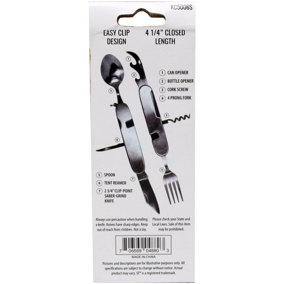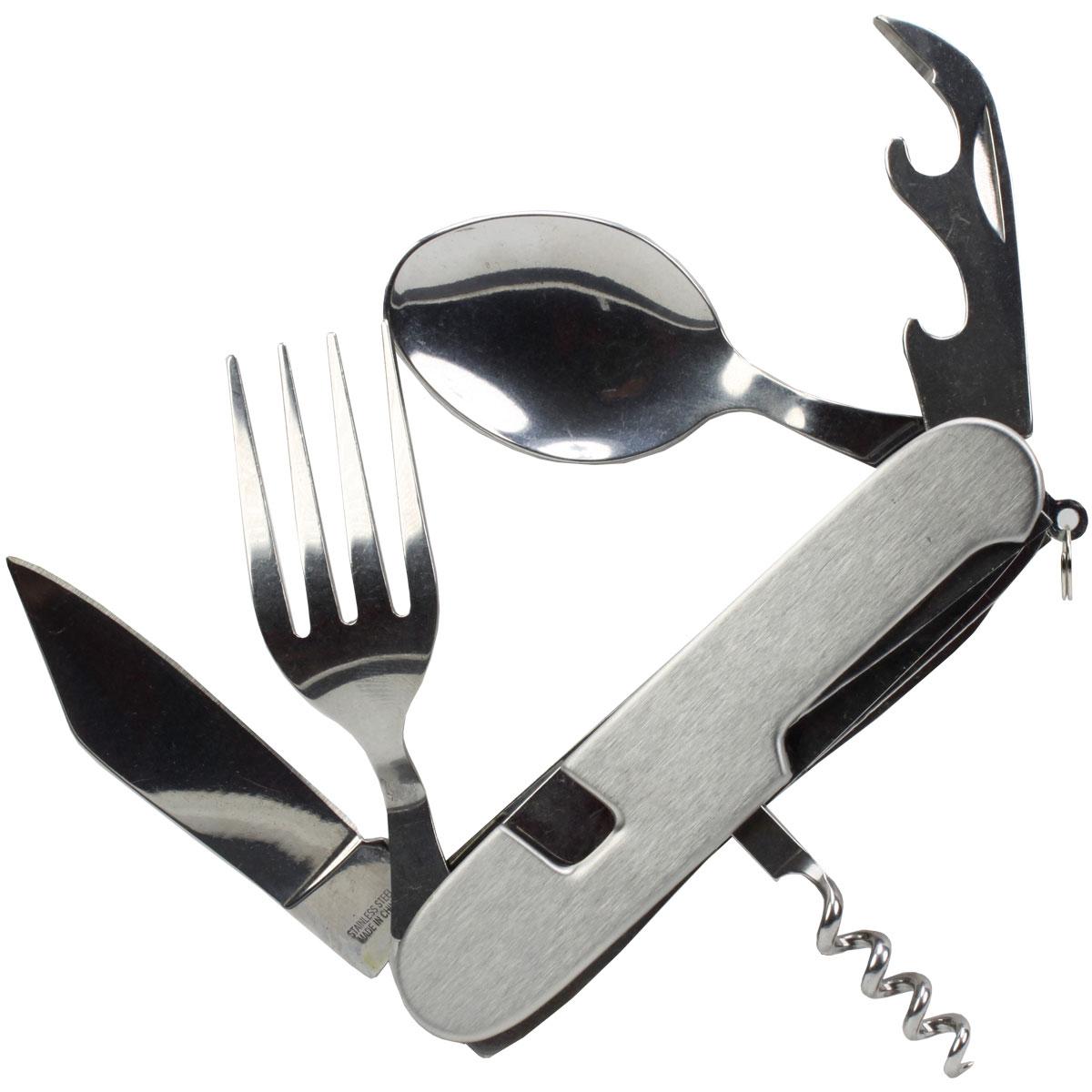 Skip to contentFork / Knife / Spoon Combo Tool is at home anywhere! This foldable utility combo is made of highly durable stainless steel and can take the heavy use that comes with any type of outdoor or survival activity which means it will never bend or melt like plastic. Not only can it unfold into TWO separate utensils but it also comes with a durable Cordura sheath that can attach to any belt, which means you can store and take this utility tool wherever you like!